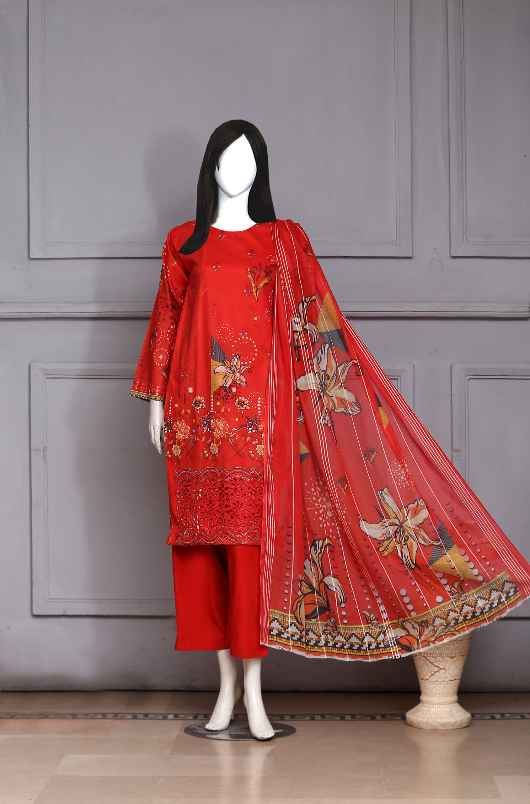 Dupatta made of embroidered cutwork bamber fabric.